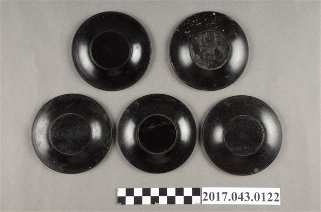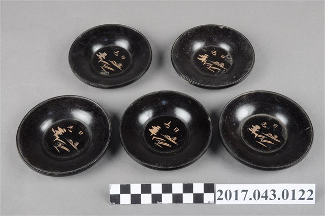 1. 黑地蒔繪風景紋茶托組,共五件,原為陳澄波先生收藏品,由其長子陳重光先生捐贈給臺灣歷史博物館。茶托組為木胎漆器,全器髹黑漆,呈面大而寬的淺碟狀,自口沿圓弧下斂至底部成圓形平底,茶托正面中心為圓形平面,用以盛放茶杯,中間以金色顏料繪製寫意樹木、小喬、遠山、房舍等紋樣,上方寫有「日□」二字,五件茶托上的圖樣相同。2. 蒔繪為一種日本的傳統工藝技術,是以金、銀、色粉等不同顏料在漆器上繪製紋樣裝飾,利用漆的黏性將圖樣固定在器皿上的一種技法。