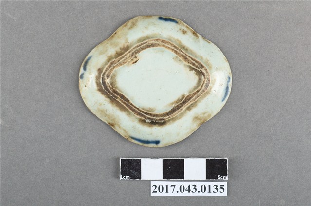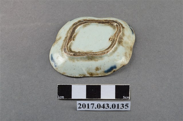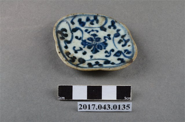手繪青花花卉紋菱形小碟為瓷質,押模法製作。薄圓唇,波形邊,器面呈圓弧邊的菱形,淺腹,弧壁下收至圈足,圈足也呈菱形,矮圈足,圈足底刮釉露胎,器底無款識,胎質略粗。器表多高溫燒製導致的氣孔以及雜質沈澱,且多有經久使用的髒污。全器施透明釉,釉面光澤略低,略為泛青。外壁少紋飾,僅在菱形的四角以鈷藍釉繪一筆做裝飾。主要紋飾繪於內壁。沿口緣繪一弦紋,碟心繪一朵花卉,周圍以卷草紋樣點綴,線條流暢,青花發色較濃但略有不均,釉色略有暈散。