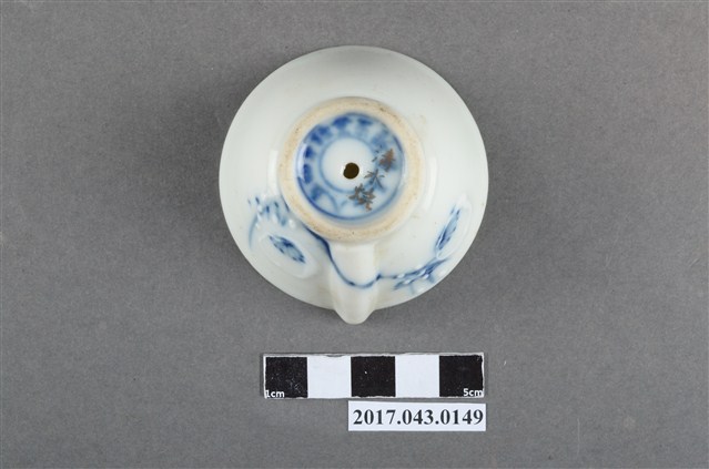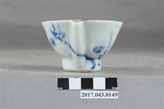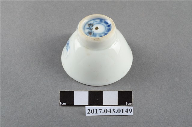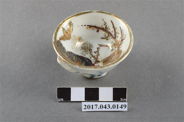 1.本件清水燒日式青花描金花鳥紋酒杯原為陳澄波先生收藏品(陳澄波基金會原始編號RE133_01),由其長子陳重光先生捐贈給臺灣歷史博物館。敞口,斜壁下收,杯底圓弧,底接高圈足,杯身側邊有一長條狀凸出為把。全器施白釉,足底露胎,口沿描金一圈,杯內以金、褐、墨綠等釉彩繪樹木與小鳥紋飾,杯外壁一側以青花和白色釉彩繪梅花紋飾,杯底圈足內側一圈青花紋飾,中央有一小洞,右側印有金色「清水燒」字樣。2.清水燒又稱「京燒」,是日本京都代表性的傳統工藝品之一,最早起源於清水寺參道的五條坂界隈燒製的陶瓷器,現在凡是在京都府燒製的陶器都可稱為「清水燒」。經濟産業大臣指定傳統的工藝品名稱是「京燒・清水燒」。