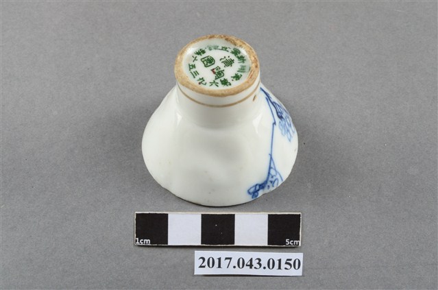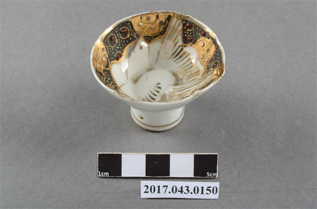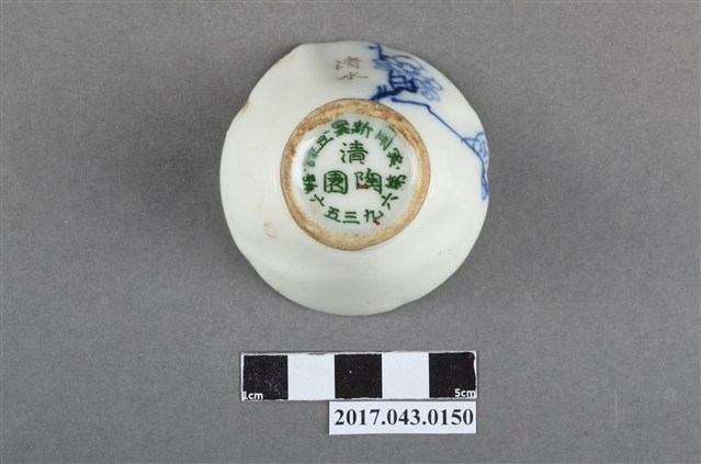 1.本件清水燒清陶園日式青花描金花鳥紋酒杯原為陳澄波先生收藏品(陳澄波基金會原始編號RE149_01),由其長子陳重光先生捐贈給臺灣歷史博物館。杯體呈倒錐形,敞口,口作五瓣花口造型,斜壁下收,高圈足。全器施白釉,足底露胎,口沿內側描金一圈,杯心繪有一隻展翅飛翔的白色小鳥,內口緣以金、紅、綠、白等釉彩裝飾一圈花卉紋,利用釉料厚度製造出淺浮雕效果,杯外壁一側以青花繪折枝梅花,旁印金色「清水」字樣,圈足上方裝飾一圈金色細弦紋,弦紋上方有一圓形小洞,杯底寫有綠色「実□新案□□」、「清陶園」、「第六九三五六號」字樣,為大正十年修訂「實用新案法」之後的特許聽得「登錄」編號,可能是昭和早期製品。清陶園是美濃名陶,而杯外壁又印有「清水」字樣,有可能是清陶園青花杯後來又在京都重新描金上繪。2.清水燒又稱「京燒」,是日本京都代表性的傳統工藝品之一,最早起源於清水寺參道的五條坂界隈燒製的陶瓷器,現在凡是在京都府燒製的陶器都可稱為「清水燒」。經濟産業大臣指定傳統的工藝品名稱是「京燒・清水燒」。