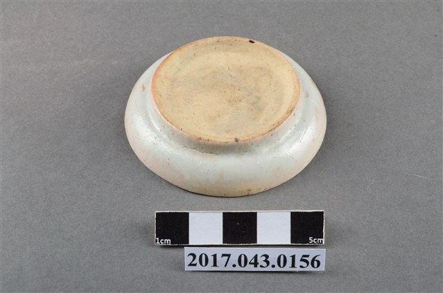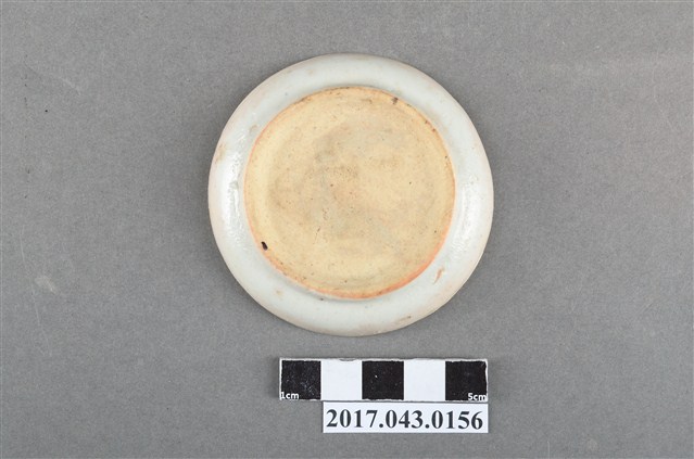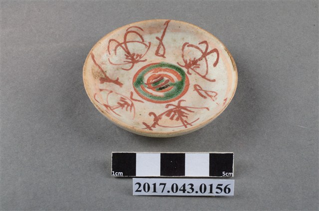 1.鬥彩蝴蝶紋小圓碟圓唇,平口,圓深腹,弧壁下收至圈足,矮圈足,圈足徑較大,平底刮釉露胎,胎色較深,胎質略粗糙且孔隙較大。全器施白色釉,唇口部分脫釉露胎,釉料呈色乳白帶黃且質地濃厚,釉色帶有些微光澤,外壁有積釉。全器釉面多有經久使用的磕碰損傷等磨耗痕跡。主要紋飾繪於盤面,以胭脂紅釉繪四隻蝴蝶紋以及三個略施綠彩的同心圓,整體以紋飾的線條粗細變化為主要表現。2.此類盤碟較尋常醬油碟來得深,通常作為盛裝小菜等配料的容器,本件器型裝飾趣味上與東南亞常見的「娘惹瓷」相近,常見於中國廣東,如潮州等地。此為民間十分常見的日用器皿,因此通常以量產製造,裝飾多變。
