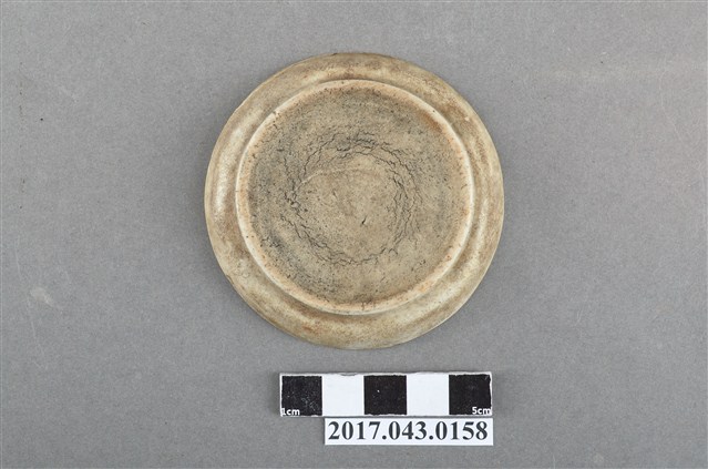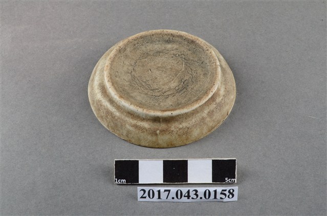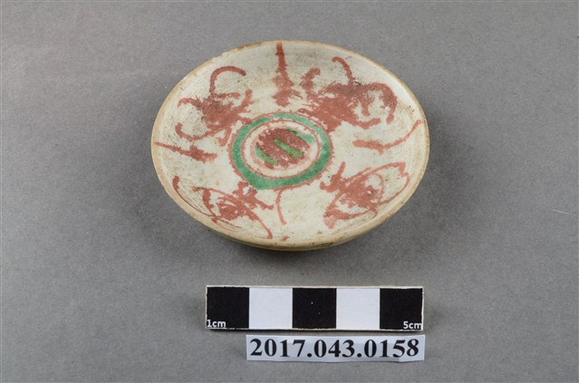 1.鬥彩蝴蝶紋小圓碟圓唇,平口,圓深腹,弧壁下收至圈足,矮圈足,圈足徑較大,平底刮釉露胎,胎色較深,胎質略粗糙且孔隙較大。全器施白色釉,唇口部分脫釉露胎,釉料呈色乳白帶黃且質地濃厚,本件作品器表釉料幾乎失去光澤度,且多有塵土累積,使器表有許多雜質髒污。全器釉面多有經久使用的磕碰損傷等磨耗痕跡,也有燒製過程因溫度產生的氣孔、縮釉等現象。主要紋飾繪於盤面,以胭脂紅釉繪四隻蝴蝶紋以及三個略施綠彩的同心圓,釉料暈散且呈色較重。紋飾用筆逸筆隨性,整體以紋飾的線條粗細變化為主要表現。2.此類盤碟較尋常醬油碟來得深,通常作為盛裝小菜等配料的容器,本件器型裝飾趣味上與東南亞常見的「娘惹瓷」相近,常見於中國廣東,如潮州等地。此為民間十分常見的日用器皿,因此通常以量產製造,裝飾多變。