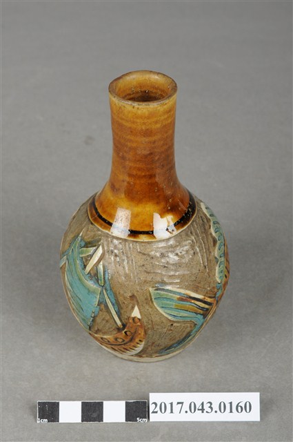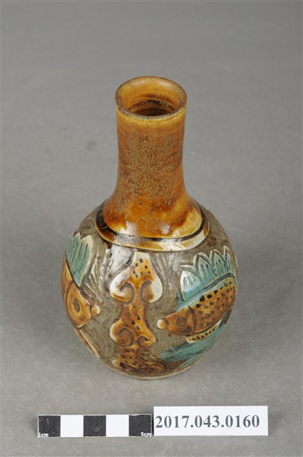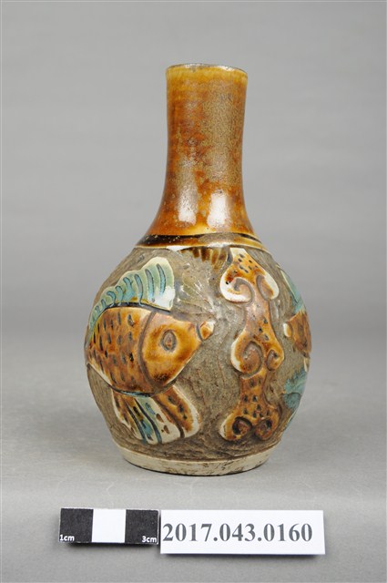 1.本件褐綠彩剔花雙魚紋小花瓶原為陳澄波先生收藏品(陳澄波基金會原始編號RE178_01),由其長子陳重光先生捐贈給臺灣歷史博物館。圓口,細長頸,斜肩,腹部呈圓球形,圈足,底部內凹,平底。全器施白釉,足底露胎,腹部刻有雙魚和帆船紋樣,再將紋樣之外的釉料剔除,露出灰褐胎色為地,使紋樣部分形成淺浮雕效果,並施塗褐色和綠色釉彩,口部、內口緣、頸部至肩部施塗褐色釉彩,肩部飾深褐色單線弦紋,圈足上方一圈和瓶底保留白色釉彩。2.剔花是陶瓷器的傳統裝飾技法之一,指刻好紋飾後,把紋飾以外的部分剔去,用以表現胎釉對比效果。