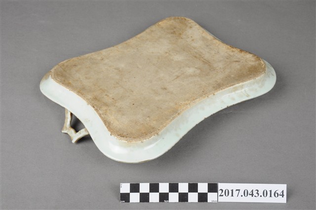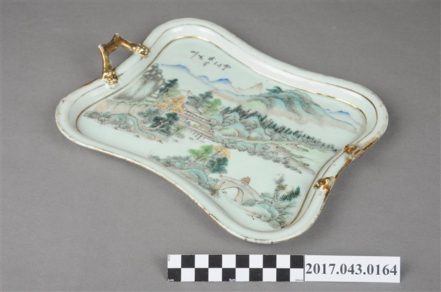 本件雙耳描金山水紋長方形茶盤原為陳澄波先生收藏品(陳澄波基金會原始編號RE173_01),由其長子陳重光先生捐贈給臺灣歷史博物館。茶盤多作端茶或端菜之用,本件茶盤為長方形平底淺盤,以胎土壓模製成,四邊中央作弧形內凹,四角圓弧,盤沿平折,兩側有耳作為把手方便持拿,其中一耳已損毀。盤面施塗白釉,底部露胎,胎為淺褐色,雙耳施塗金色釉裝飾,盤沿、折痕處與盤面周圍皆描金色細線,盤面中央繪山水紋飾,左上方寫有「雪冬月求□□什」字句。