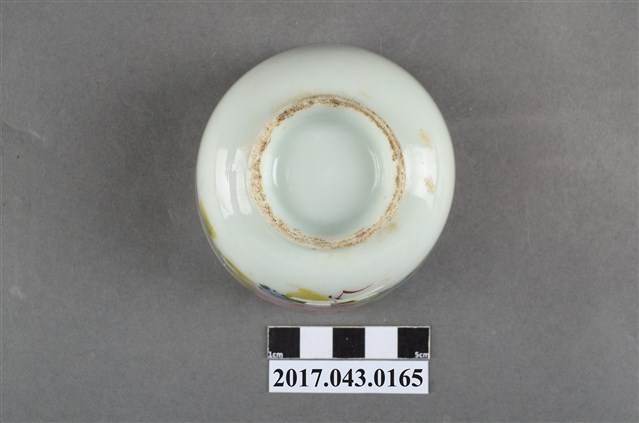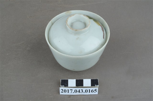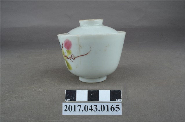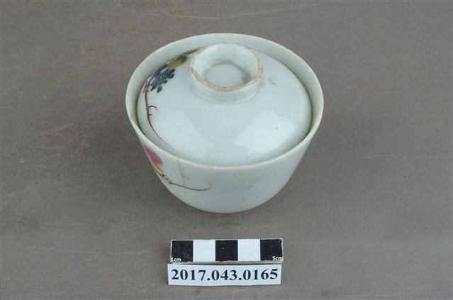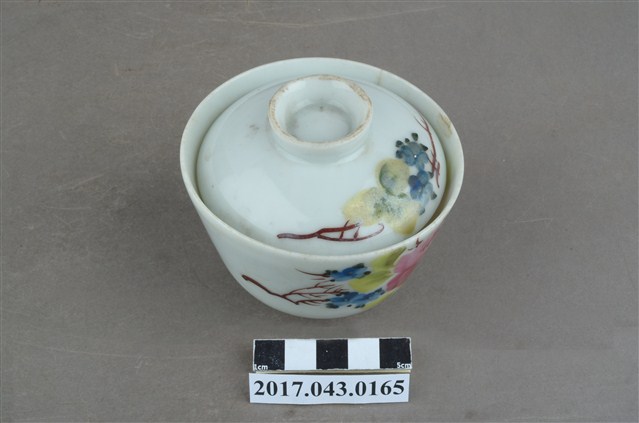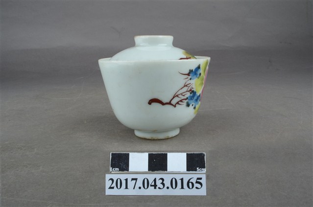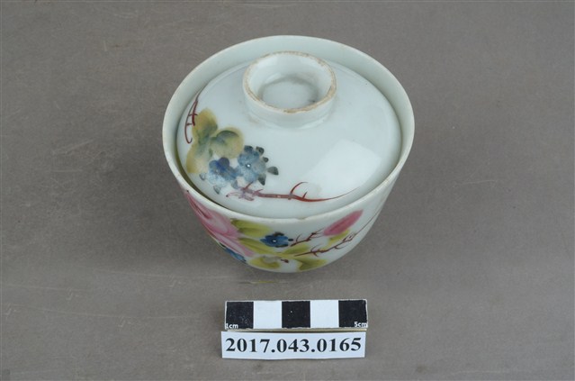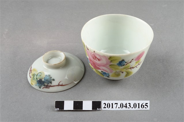 本件彩瓷玫瑰紋蓋杯原為陳澄波先生收藏品(陳澄波基金會原始編號RE146_01),由其長子陳重光先生捐贈給臺灣歷史博物館。分為杯身與杯蓋兩部分,杯身為敞口,斜壁下收,圓腹,圈足,杯口上覆杯蓋,蓋面為半圓弧形,蓋鈕呈圈形,杯蓋直徑略小於口徑、大於底徑,可放置在杯內緣,以達到防塵保溫效果。全器施釉,蓋鈕圈頂與圈足底無釉,釉面通透有光澤,杯內壁素面無紋,杯外壁與杯蓋面一側印有彩色玫瑰花卉紋飾。