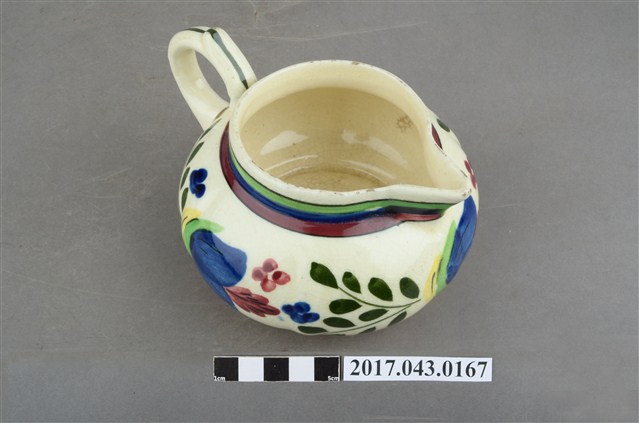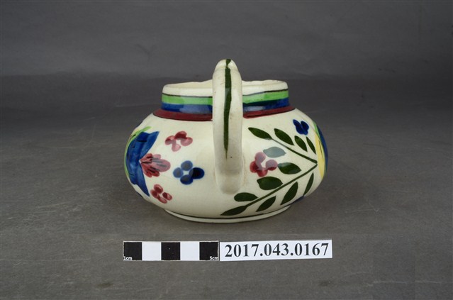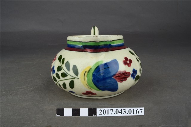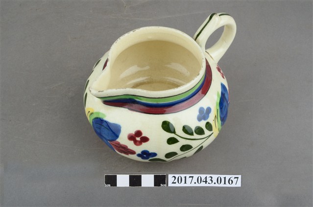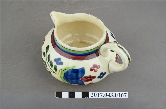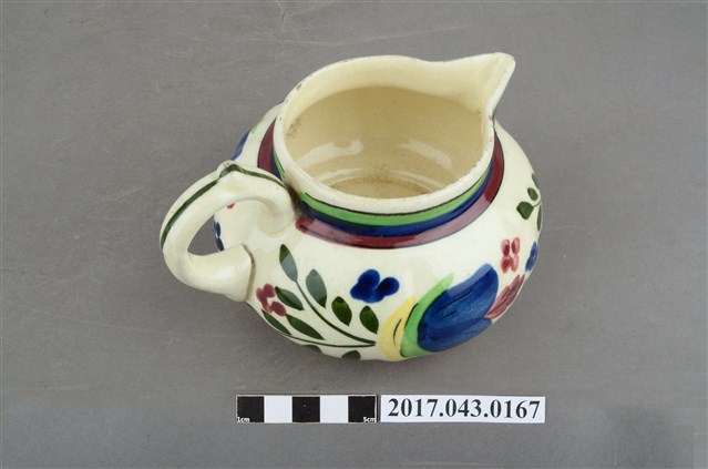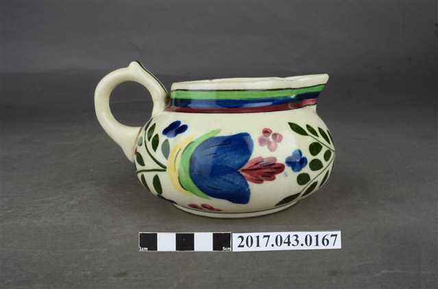 1.本件彩繪花卉紋奶罐原為陳澄波先生收藏品(陳澄波基金會原始編號RE155_01),由其長子陳重光先生捐贈給臺灣歷史博物館。廣口帶流,口呈圓形,流為尖角狀,短直頸,器腹呈扁圓形,帶有圈把,平底,底有圈足。全器施白釉,略帶牙黃色調,足底露胎,內器壁素面無紋,釉面開片,外器壁頸部飾綠、藍、紅三圈寬橫紋,腹部彩繪花卉紋飾,把中央與圈足上方各飾一道綠色細線紋,杯底印有彩帶圖樣和「MADE IN JAPAN」字樣。2.本件用途為盛裝牛奶供倒入咖啡或茶中混合飲用,另外也可以作為醬汁罐或油罐來使用,為當時所稱的洋食器,可能是昭和時期萬古製品。