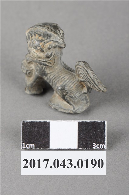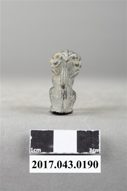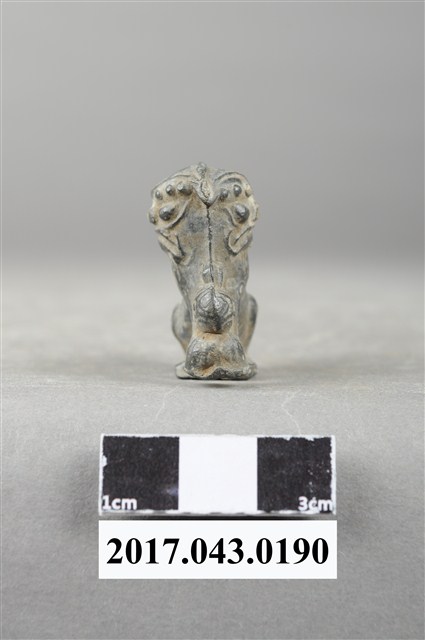 1. 錫製獅形酒壺蓋紐,原為陳澄波先生收藏品(陳澄波基金會原始編號RE197_02),可能是陳氏遷居上海時購買,後來由其長子陳重光先生捐贈給臺灣歷史博物館。以中國常見的傳統吉祥圖案「獅子戲球」為造型,獅子的一隻前腳抬起抓著顆圓球,面部五官清晰,身體和尾巴以直線條紋裝飾,外觀呈銀灰色,溝紋內凹處有部分因氧化而帶有褐色斑點。2. 獅子戲球的造型常見於民間祭典中用來盛裝酒水的酒壺蓋上,酒壺一般會與數只酒杯和托盤呈組配置,用以祭祀神祇或祖先,表達崇敬之意。