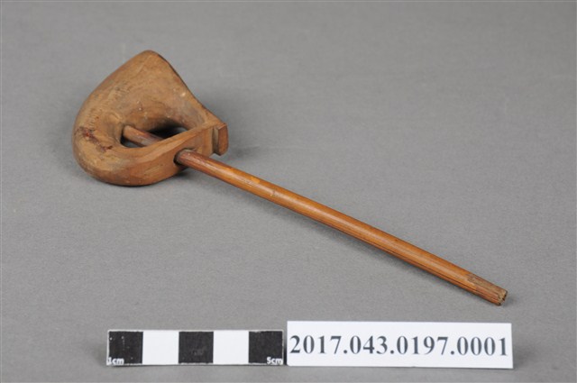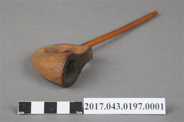 1.臺灣原住民煙斗,為2017.043.0197之部件之一。本件煙碗為木製,煙管為竹製。煙碗素面無紋,但造型特殊,後方有大幅度環狀彎曲樣式。煙碗因經年使用,上方口部帶有一層焦油及燻黑狀。2.臺灣原住民族吸食煙草之文化由來已久,所使用之煙斗多以木、竹作為材料,並區分為煙碗及煙斗兩部分,先將煙碗一側穿孔之後再插入煙管即成為煙斗。煙碗的樣式,各族皆有其特色,且就算同一族群,亦有多種形制,此外,臺灣原住民族女子一般喜好將煙斗插於頭髮上,作為髮簪之用。
