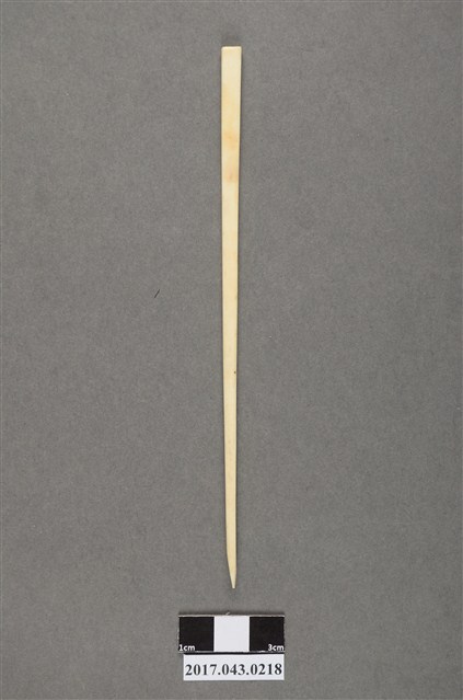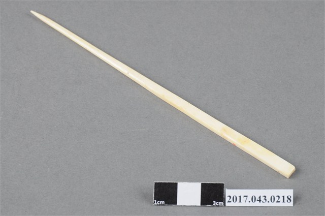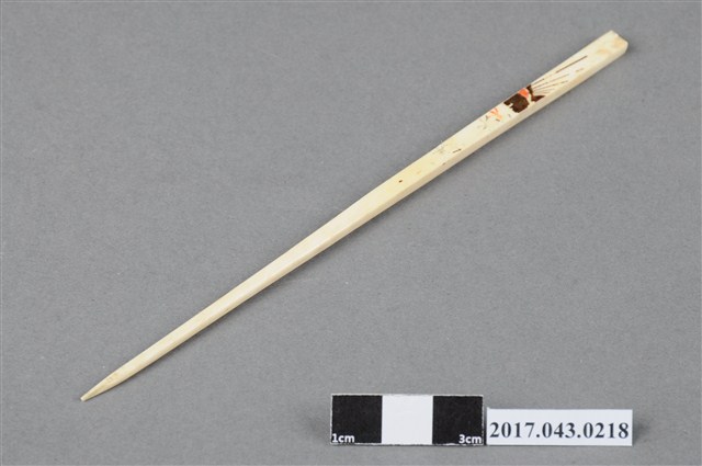 1. 本件日本製象牙筷原為陳澄波先生收藏品(陳澄波基金會原始編號RE226_11),由其長子陳重光先生捐贈給臺灣歷史博物館,共20支。外形呈細長條形,約長15.6公分,頭部略細、尾部稍寬,頭圓尾方,尾端為0.6x0.4公分的方形,頭部漸收打磨成尖角,略歪向一側。材質為象牙,顏色呈現淡黃色,筷子其中一面的上半部繪有紋飾,但因使用磨損,現已無法辨識原來紋樣為何,僅見些許褐色和粉紅色的線條與色塊。2. 頭尖尾方是日本筷子常見的形制,使用時需兩支一起使用,將食物夾起送入口中,為一般民眾生活中的飲食器具。筷子一般多以木頭或竹子製作,象牙則為較高級的材質。