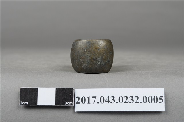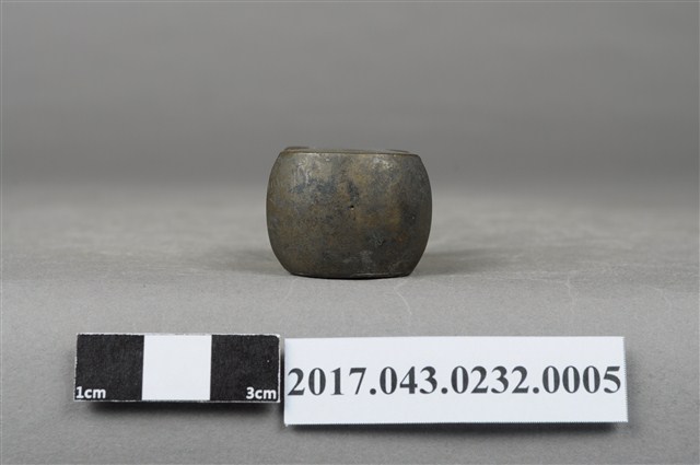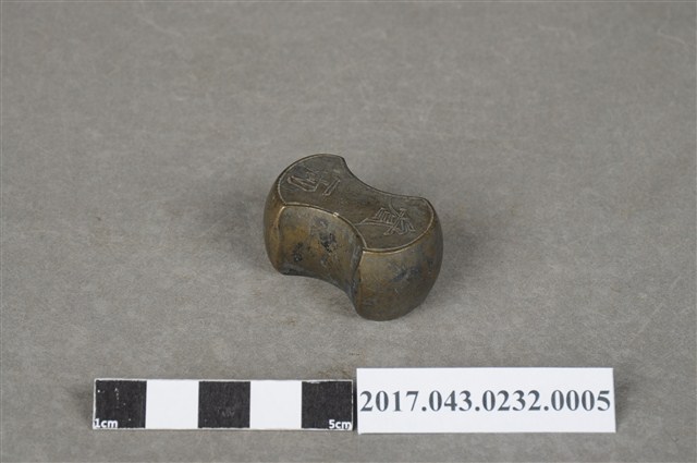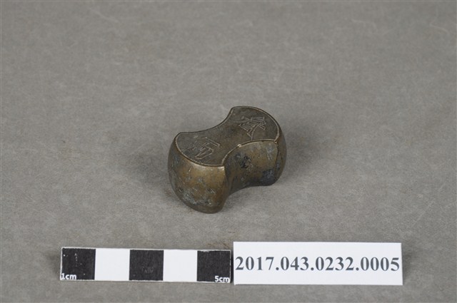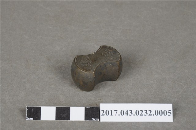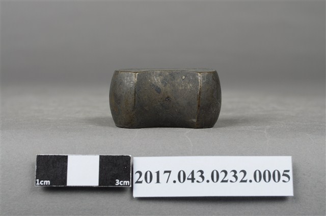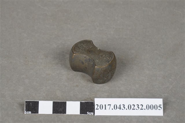 1.本件叁兩砝碼為天平用砝碼組組件之5,銅製材質,外形呈厚度2公分的桑繭形,或稱元寶形,長寬大小僅略小於同組的4兩砝碼,上方表面有「叁兩」的中文刻字,方便使用者辨認砝碼重量。本件砝碼因表層銅氧化致整體呈黑色,黑色下方依稀可見銅色光澤。2.早期砝碼通常以銅金屬製作,又名「銅權」、「秤砣」,日本則稱為「分銅」,測重時,在天平一端放置待測物品,一端放置砝碼,當兩端達成平衡時,砝碼端的重量總和即為待測物品的重量。一套完整的天平秤通常包含了天平衡杆、作為支點的提紐或是木軸、兩個秤盤、懸吊秤盤的絲線以及一套包含各種重量的砝碼組合。2.中國於唐代以後直至明清,度量衡制度相對統一,東亞各國如日韓,其傳統計量體亦深受中國影響。其中重量單位由大至小為:石、斤、兩、錢、分,1石為16斤,1斤為16兩,1兩為10錢,1錢為10分。