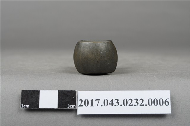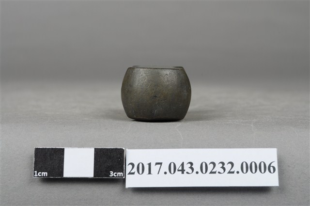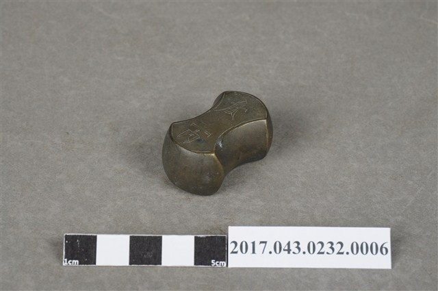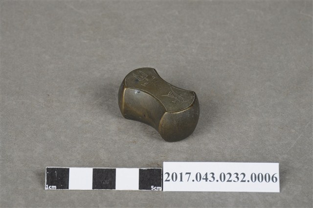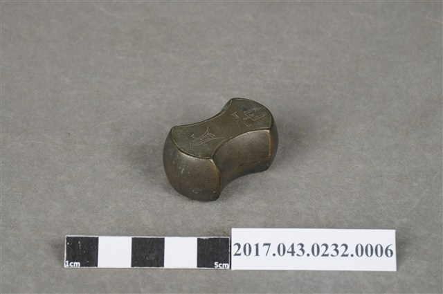 1.本件貳兩砝碼為天平用砝碼組組件之6,銅製材質,外形呈厚度1.9公分的桑繭形,或稱元寶形,上方表面有「貳兩」的中文刻字,方便使用者辨認砝碼重量。本件砝碼表層銅氧化程度輕微,整體呈深銅棕色,氧化層下依稀可見銅色金屬光澤。2.早期砝碼通常以銅金屬製作,又名「銅權」、「秤砣」,日本則稱為「分銅」,測重時,在天平一端放置待測物品,一端放置砝碼,當兩端達成平衡時,砝碼端的重量總和即為待測物品的重量。一套完整的天平秤通常包含了天平衡杆、作為支點的提紐或是木軸、兩個秤盤、懸吊秤盤的絲線以及一套包含各種重量的砝碼組合。2.中國於唐代以後直至明清,度量衡制度相對統一,東亞各國如日韓,其傳統計量體亦深受中國影響。其中重量單位由大至小為:石、斤、兩、錢、分,1石為16斤,1斤為16兩,1兩為10錢,1錢為10分。