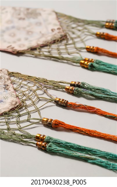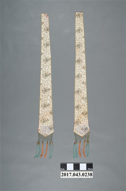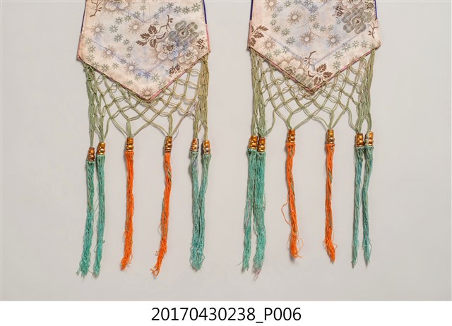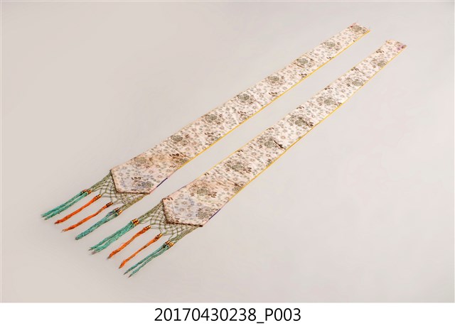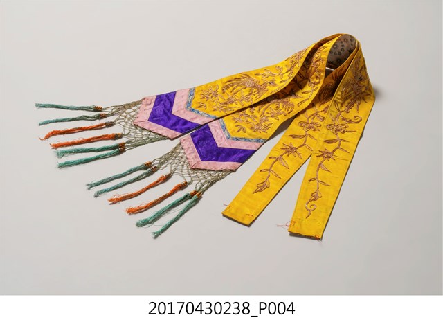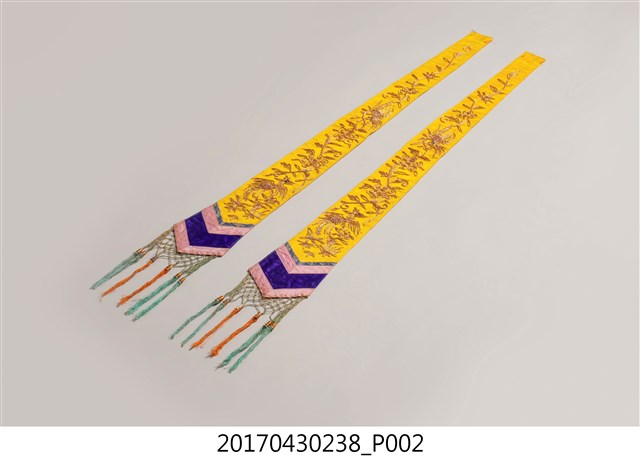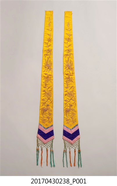 1. 金黃絲緞花鳥紋劍帶組,共1組2件,包含一對形制與刺繡圖樣皆相同的劍帶。劍帶呈長條形,頂端較狹小,至底部逐漸擴大,底端作三角形銳角狀,下接縫綠色網格及橘色、藍綠色流蘇裝飾。劍帶正面為金黃色底布,其上使用釘金繡、盤金繡,以金線繡出花卉、喜鵲和鳳鳥圖案。圖案下方縫製花布、粉紅、靛藍、粉紅四層飾帶。劍帶背面無刺繡,以白色花布襯底,花布圖案為團花紋,周圍並旋繞碎花紋飾。2. 劍帶因其形狀狹長似劍而得名,是一種廣為裝飾在織品服飾上的刺繡飾物,常見裝飾於帳簾、雲肩、上衫、下裙等。早期臺灣人會在床的兩旁吊掛劍帶,以祈求避邪防身。此外,劍帶也是象徵新婚的禮俗用品,臺灣早期嫁娶時會購置紅眠床作為嫁妝,以祝賀新婚,並於紅眠床前緣兩側掛墜一對劍帶作裝飾,增添喜慶的氛圍。劍帶的刺繡圖案多樣,如花鳥、八仙、龍鳳、詩句對聯等等,大部分帶有吉祥喜慶的意涵。
