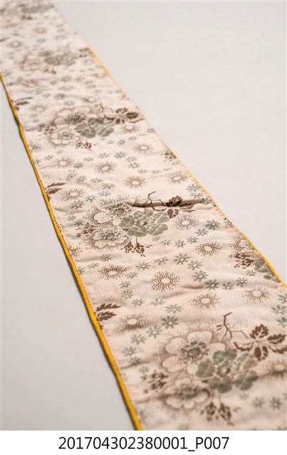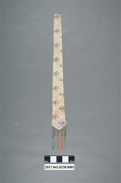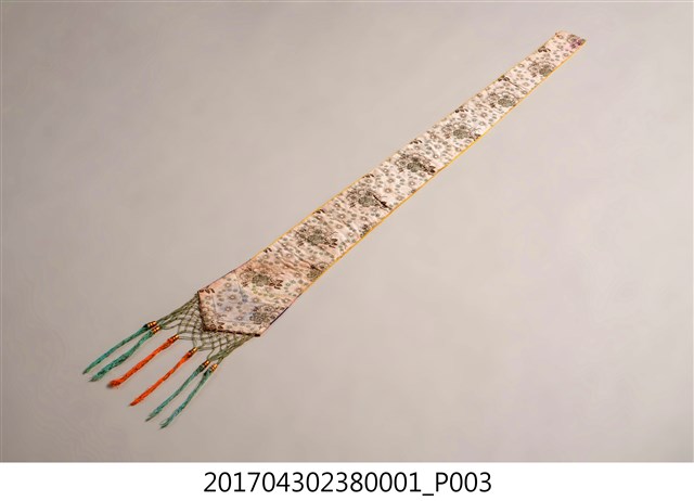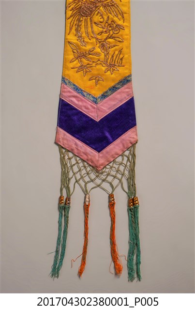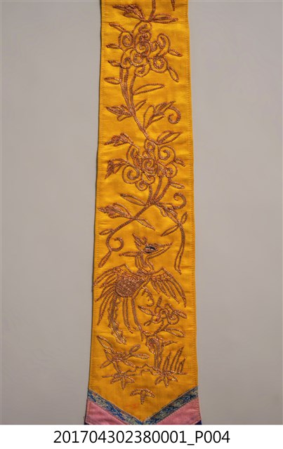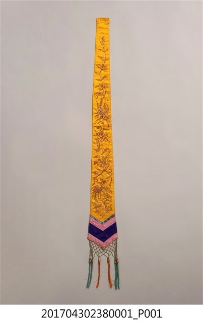 金黃絲緞花鳥紋劍帶,造型呈長條形,全長達110.7公分,頂端較狹小,至底部逐漸擴大,底端作三角形銳角狀,下接縫綠色網格及藍綠色與橘色之流蘇裝飾。劍帶正面為金黃色底布,其上使用釘金繡、盤金繡,以金線繡出花卉、喜鵲和鳳鳥圖案。圖案下方縫製花布、粉紅、靛藍、粉紅四層飾帶。劍帶背面以白色花布襯底,花布圖案為團花紋,周圍並旋繞碎花紋飾,上有些許漬痕,底端並有些許藍紫色、粉色移染痕跡。