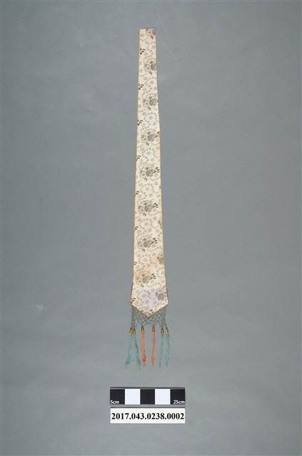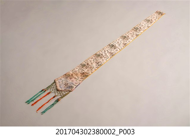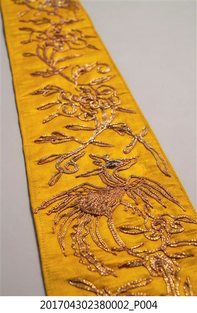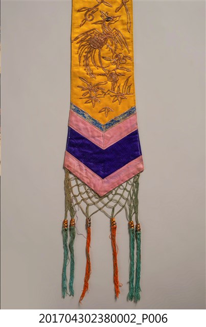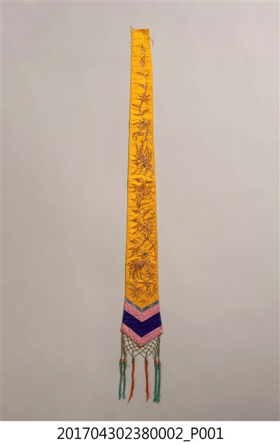 金黃絲緞花鳥紋劍帶,造型呈長條形,全長達109.8公分,頂端較狹小,至底部逐漸擴大,底端作三角形銳角狀,下接縫綠色網格及藍綠色與橘色之流蘇裝飾。劍帶正面為金黃色底布,其上使用釘金繡、盤金繡,以金線繡出花卉、喜鵲和鳳鳥圖案。圖案下方縫製花布、粉紅、靛藍、粉紅四層飾帶。劍帶背面以白色花布襯底,花布圖案為團花紋,周圍並旋繞碎花紋飾,上佈有些許漬痕,上端有一處紅色移染,及下端有靛藍色飾帶的移染痕跡。