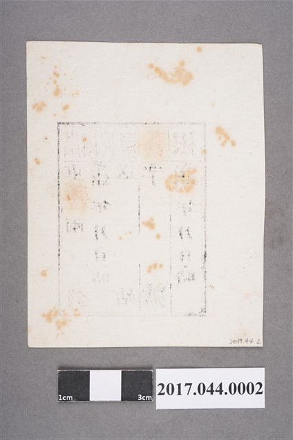 1.本件為清代臺灣郵政局所發行的公務用郵票1枚,印刷「臺灣郵票,重、兩、錢,光緒年、月、日,送、站,字、號,根」等字樣,並另外蓋上紅色「善」字。2. 1888年劉銘傳創立了全省性的郵政服務,當時發行了幾種郵票,郵票皆相當大張,板模是木製的,以黑色墨料手工蓋印。此種郵票為官用郵票,由數張訂成小冊,每冊有100枚,第一版的左側只有「根」字,第二版則有「郵票根」三字,是臺灣民主國發行郵票之前的公務用郵票。(蔡宜璇撰寫)