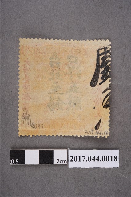 1.本件為倫敦Bradbury, Wikinson公司在1888年6月所印製的臺灣郵票,上印有,「大清臺灣郵政局,制錢貳拾文,Formosa,China」等字樣,面額為制錢20文,中間的圖分為兩部分,上龍下馬,故又稱「龍馬票」,整張皆為紅墨印製。此外有以黑色墨水寫上的「臺北至錫口洋五點」的字樣。2.清代發行的臺灣龍馬票原用途為郵票,有紅、綠兩色,然而它從未被當成郵票使用,而多作為火車票,因此車票上常有車站名稱註記,如此張郵票便有「臺北至錫口(按:今松山)」的註記,如今這些龍馬票已成為許多集郵家爭相收藏的對象。(蔡宜璇撰寫)