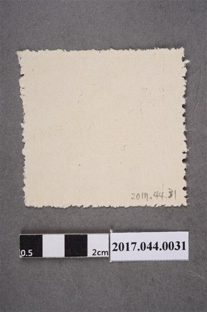 1.本件清代臺灣偽龍馬郵票1枚,與正版郵票相同地,上印有「大清臺灣郵政局,制錢貳拾文,Formosa,China」等字樣,面額為制錢20文,中間的圖分為兩部分,上龍下馬,紅墨印製;然而在對照之下,可明顯看出其字體與刻印的方式與正版不同。郵票左上方有一郵戳印,內容難以辨識;然而只作為火車票使用的龍馬票出現郵票用的郵戳是不合理的,是其為贗品的證據之二。2.清代發行的臺灣龍馬票原用途為郵票,有紅、綠兩色,然而它從未被當成郵票使用,多作為火車票,如今龍馬票已成為許多集郵家爭相收藏的對象,就連偽票也是炙手可熱。(蔡宜璇撰寫)