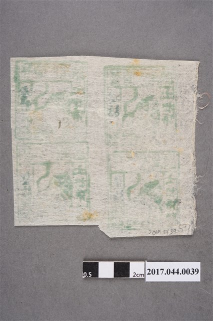 1.本件為臺灣民主國郵票第一版30錢四方連共4枚。第一版發行時間可能為1895年8月16日或更早,由於板模使用當地銀鑄造,品質低劣,因此使用不久後便遭熔毀,發行數量約7000~8000套。此張票面為綠色,郵票上方印有「臺灣民主國」,左下寫有「士担帋」,右側則為「錢」,中間為一老虎圖樣,老虎為臺灣民主國之重要象徵;然而或因年代久遠或前述鑄模品質低劣的因素,印痕模糊。「錢」字上方的「參拾」顏色較其他地方鮮明,據捐贈者李明亮推測,面額部分應該是以另一個印章蓋上的。2.臺灣民主國郵票又稱「獨虎票」,部分西方文獻指為「黑旗票」。據捐贈者李明亮指出,臺灣民主國郵票是1895年8月任職安平海關的英國人麥嘉林(C. A. McCallum)所創,交由安平海關經營,最初發行的動機是為了替黑旗軍劉永福籌備軍餉,先後發行了五種版次(包括試用版),每版發行一套三枚,面值30錢、50錢、100錢。試用版、第一版至第三版可能的發行時間約為1895年8月中旬至9月初期間,使用至同年10月19日,第四版則未被使用過。郵票印製方式是以手工逐一蓋印,最後再以另一版模印上面值。 (蔡宜璇撰寫)