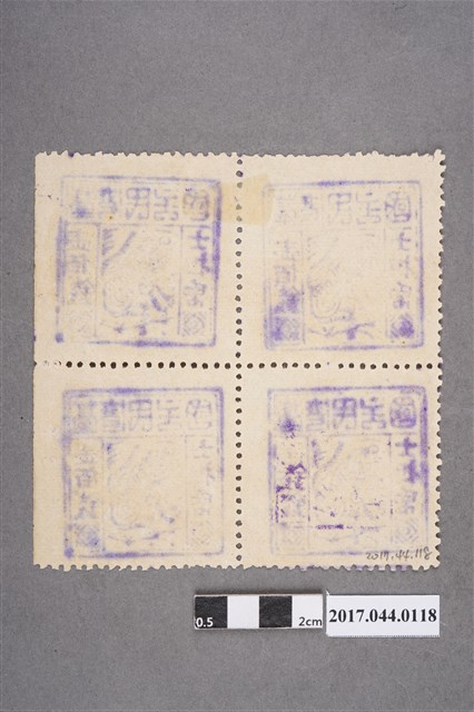 1.本件為臺灣民主國第三版(B)100錢郵票四方連共4枚。此張郵票票面為紫色;郵票上方印有「臺灣民主國」,其中「主」字左上方斷一劃,是辨認第三版的重要依據;左下寫有「士担帋」,右側則為「錢」,面值「參拾」則為另外印上;中間為老虎的圖像,此版本老虎頭上的「王」字通常較前兩版明顯;從其邊緣的鋸齒狀及四連間的打洞可以得知此版本有齒孔。2.第三版郵票根據其紙質不同分為A、B兩種類型,A紙質薄,B則為厚紙,此張郵票為A型;30錢通常為藍色票面,50錢為紅色,100錢應為紫色,但因後期紫色墨水用罄,在B型票中分為紫色及黑色兩種。B型紙張雖然較厚,卻有較嚴重的印痕問題,可從此張雙連郵票左下方觀察到。其官方發行數量有18000套,是獨虎票中數量最多者。2.臺灣民主國郵票又稱「獨虎票」,部分西方文獻指為「黑旗票」。據捐贈者李明亮指出,臺灣民主國郵票是1895年8月任職安平海關的英國人麥嘉林(C. A. McCallum)所創,交由安平海關經營,最初發行的動機是為了替黑旗軍劉永福籌備軍餉,先後發行了五種版次(包括試用版),每版發行一套三枚,面值30錢、50錢、100錢。試用版、第一版至第三版可能的發行時間約為1895年8月中旬至9月初期間,使用至同年10月19日,第四版則未被使用過。郵票印製方式是以手工逐一蓋印,最後再以另一版模印上面值。 (蔡宜璇撰寫)