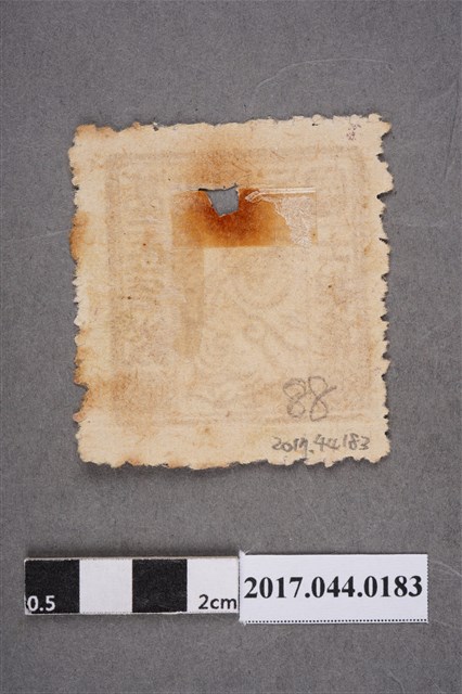 3.臺灣民主國郵票又稱「獨虎票」,部分西方文獻指為「黑旗票」。據捐贈者李明亮指出,臺灣民主國郵票是1895年8月任職安平海關的英國人麥嘉林(C. A. McCallum)所創,交由安平海關經營,最初發行的動機是為了替黑旗軍劉永福籌備軍餉,先後發行了五種版次(包括試用版),每版發行一套三枚,面值30錢、50錢、100錢。試用版、第一版至第三版可能的發行時間約為1895年8月中旬至9月初期間,使用至同年10月19日,第四版則未被使用過。郵票印製方式是以手工逐一蓋印,最後再以另一版模印上面值。 (蔡宜璇撰寫)