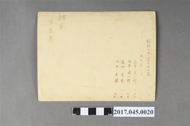 1. 本張照片為林桂興全家6人合照,除林桂興和妻子李金釵,小孩由右至左依序為:長子林修文、次子林武二、次女林秀蘭、長女林秀菊,照片攝於林桂興弟弟林桂龍所經營「金龍照相館」。照片背面寫有:「昭和九年12月30日寫,贈呈有生君,長男 文一郎 13歲,次男 武一郎 7歲,長女 秀菊 11歲,次女 秀蘭 5歲」等字。