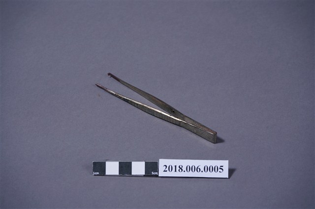 鐵製鑷子前端一側有勾一側無勾,表面有橫條紋,為臍帶護理使用的器械。