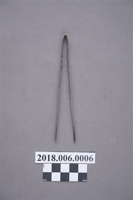 鐵製鑷子前端無勾,較圓滑,表面有橫條紋,為臍帶護理使用的器械。