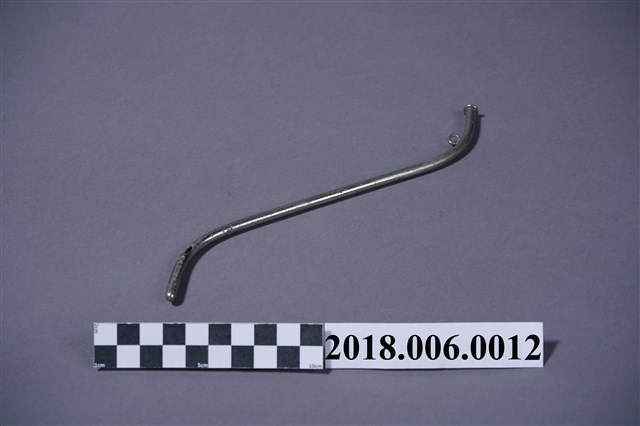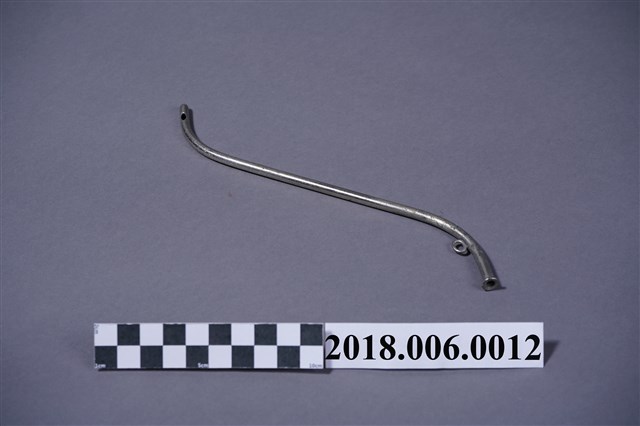 鐵製細長條構造,兩端有弧度,一端表面有橢圓形缺口,一端有環形勾及最前端鏤空。