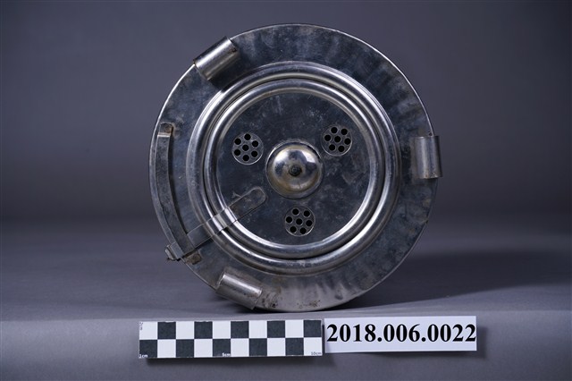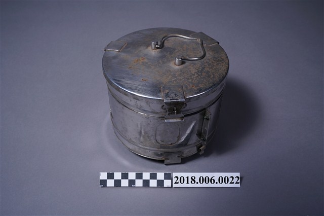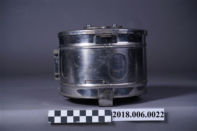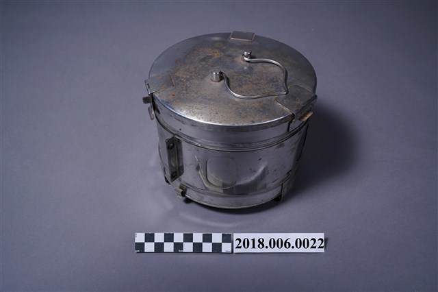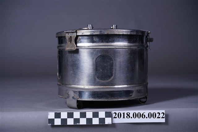 本文物為高壓蒸氣消毒敷料罐,形制為圓柱體的鐵製敷料罐有蓋,蓋面有提環,側面有卡榫設計,內部有孔洞,有立柱可撐起敷料罐,不會直接接觸地面。
