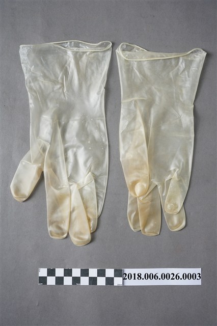 本文物為消毒矽膠手套,是左右手的白色手套,手指端有淡黃色的痕跡,主要用為探查子宮口是否全開及接生時使用。