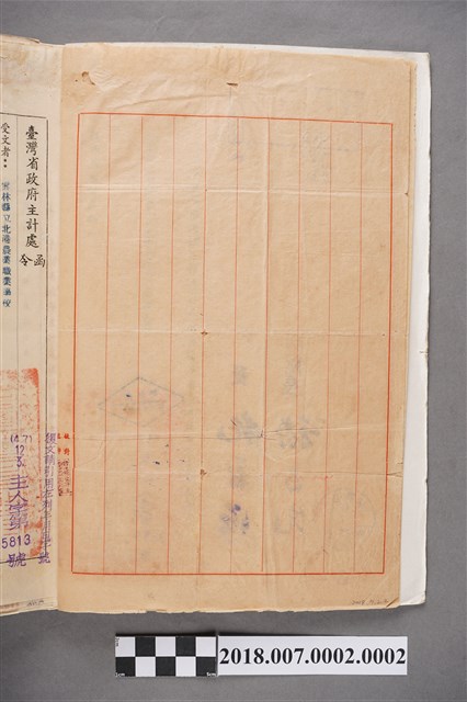 本件為中華民國47年7月12日(1958年)臺灣省政府主計處令,文號為(47)7.12主人字第2883號,文鍵由原雲林縣立北港農業職業學校主計室主任,改派任為代理雲林縣立北港農業職業學校主計室薦任主任一職,由當時的處長紀萬法、副處長嵇昌先署名用印核發。文件左下有「北港農校47.7.25收文第723號」之收發章印;左上方有主辦人、收發人的格式章,並以手寫47年7月25日送令總務處、人事室。物件由捐贈者對折與他份文件集結成冊收藏,文件上蓋有關防大印、銓敘部辦理退休審核等印鑑,以及左上方有鉛筆編號註記2。