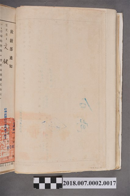本件為中華民國60年4月9日(1971年)銓敘部通知,60臺為甄一字第05921號,為文鍵由行政院主計處任用至臺灣省臺中市立第二國民中學主計室主任之一案,經銓敘部審定後由部長石覺署名用印核發。文件左側有虛線鋸齒狀裁剪痕跡,且右上側註明此為第一聯送送審人,推測應為一式兩份。物件由捐贈者與他份文件集結成冊收藏,文件上蓋有關防大印、銓敘部辦理退休審核等印鑑,以及左上方有鉛筆編號註記17。