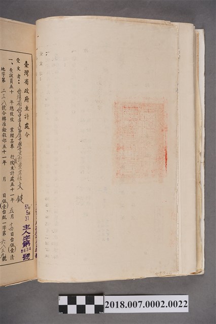 本件為中華民國50年5月(1961)臺灣省政府主計處令(50)5.16主人字第7381號,文鍵任職臺中市立第二中學主計室主任之中華民國49年考績表,由處長沙德堅、副處長嵇昌先署名核發。物件由捐贈者與他份文件集結成冊收藏,文件上蓋有關防大印等印鑑,以及左上方有鉛筆編號註記22。