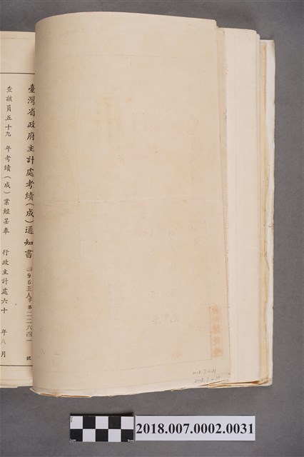 本件為中華民國59年6月(1970)臺灣省主計處考績(成)通知書,文號59.6.22主人字第16266號,文鍵任職臺中市立第二中學主計室主任之中華民國58年考績表,由處長劉紹志、副處長嵇昌先署名核發。物件由捐贈者與他份文件集結成冊收藏,文件上蓋有關防大印等印鑑,以及左上方有鉛筆編號註記31。