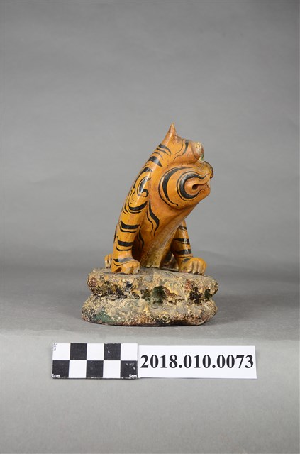本件木雕虎爺像作黃虎,身上繪黑色斑紋,身軀右側數道細裂痕。虎爺作蹲坐姿勢,頭部在右轉向前方,雙眼浮凸直視前方,眼珠褪色,耳朵豎直,緊閉血盆大口,露出上排門牙及犬齒。前肢伸直向前斜立,後肢蹲坐於臺座上,金黃色皮毛上繪黑斑紋,身軀與四肢交接處作螺紋。尾巴由兩後肢之間自左腹部向上伸出,高翹於背上。臺座作岩座,平面雕鑿不規則狀,四周鑿凹,施綠、紅、黃相間漆面,底端施朱漆,佈有裂痕。