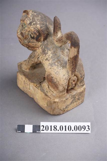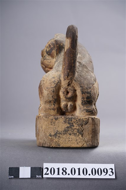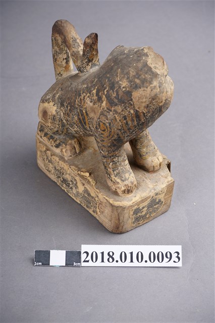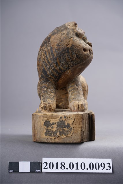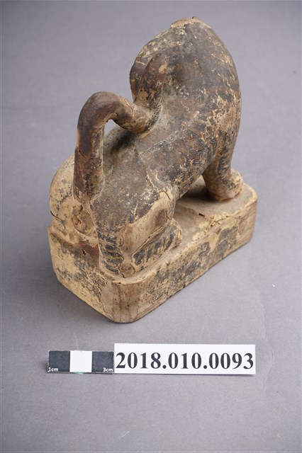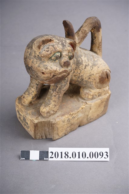 本件木雕虎爺像作黑虎,表面裝飾斑駁剝落,右耳缺損,臺座右前角削落。虎爺作蹲坐姿勢,頭部在右轉向前方並斜向左方,雙眼圓凸,直視前方,耳朵豎直,緊閉大口,露出上排犬齒。前肢伸直向前斜立,後肢蹲坐於臺座上。黑皮毛上繪黃斑紋,斑紋模糊。尾巴上翹,作S形貼伏於背上,臀部後端中央作一紅色排泄孔。臺座作矮方台,四角收圓,漆面局部剝落。