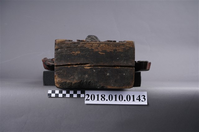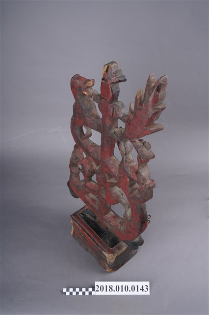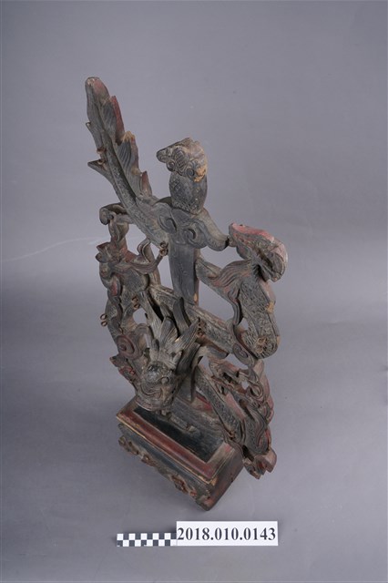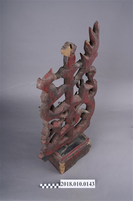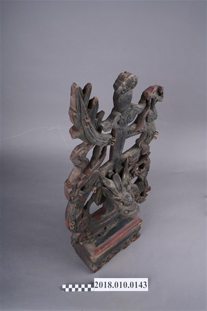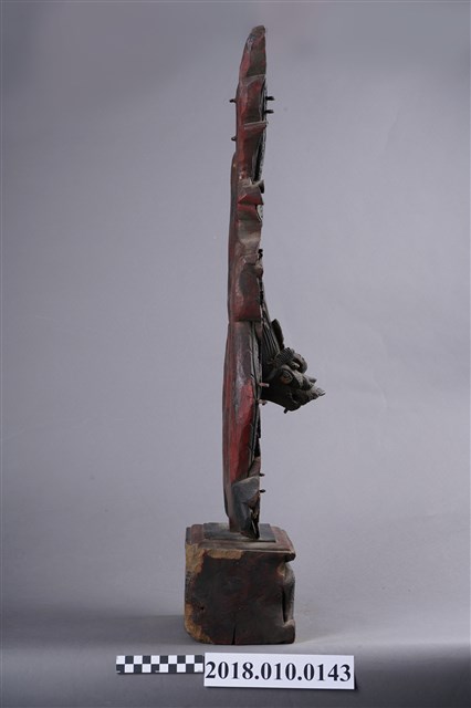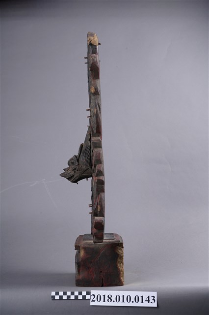 本件木雕龍神座作正面蟠龍神座造形,表面佈滿污漬,背後露出朱紅底漆,正中央作一把寶劍插在臺座上,劍身蟠曲一條龍,龍頭略有磨損,背後龍身與寶劍之間有數處補釘固定,臺座後端兩側磨損。神座寶劍握柄在上,劍尖插入臺座中,護手及頓頭作如意紋,頓頭左側磨損,劍刃雕捲草紋。蟠龍之龍頭居寶劍中下段位置,雙眼突出,鬃毛向上擴張,龍身自左下蟠繞而上,龍尾伸至右上方,尾端朝上。龍身雕有四肢,爪作三爪,周圍有雲朵相連,身上釘有十餘個小銅環釘。臺座作方台,正面雕櫃臺腳,中央一朵梔子花,兩腳雕石榴紋及如意紋,底面一道深裂痕。