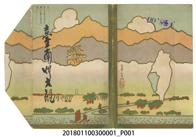 此為金子常光繪〈臺南州大觀〉鳥瞰圖之封套,封面左方有臺南州大觀字樣,左上有則有書簡圖繪字樣,並有可貼郵票之處,顯示其作為類似風景明信片之功能。構圖則是南方風情,並有河流,推測為安平運河,並有竹筏。代表臺南意象。封底則是臺灣地圖並顯示臺南州位置,且有作者落款。