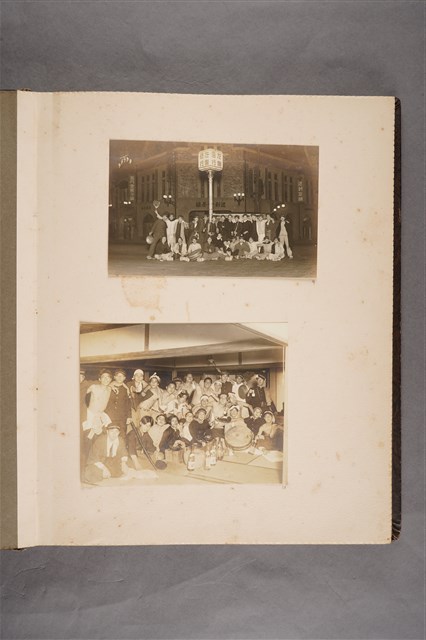 1. 臺北高校學生手持ストーム道具於辻利茶舖、及左側通行的標誌前留影,辻利茶舖右側為風月堂菓子舖,上方有キヤラメル字樣,辻利茶舖初期設店在今武昌街、漢口街交叉處,經兩次遷址,才搬到今重慶南路與衡陽路口,現址為台北市中正區重慶南路一段104號。2.ストーム為臺北高校學生生活中的一項團體活動,為了擾亂或震驚周圍環境,或因激情昂揚而自然發出,也帶有發洩青少年精力的意味在裡面。是形塑臺北高校生[蠻風]特徵的一項實際表現。3. 如施純仁描述,大家勾肩搭背橫作數排,在宿舍集體敲鑼打鼔又唱又跳,或突於夜間發動,另也依地點與目的,分作幾種形式,如歡迎ス卜一厶、送別ス卜一厶、祝勝ス卜一厶,大多在宿舍或學校內進行。在街頭出現的ス卜一厶通常在校慶或者對抗賽之後,此外,ス卜一厶也可能在山中、海濱、路旁、旅館等不定處所,因情緒高昂而自然發起。(陳妍君撰寫)