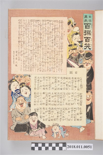 本圖冊為合訂本,共分為兩個部分,一個部分是日本萬歲百撰百笑(除目次外,共有62圖,作者皆為骨皮道人,畫家為日本浮世繪畫家小林清親),另一則為滑稽倭日史記(10張圖)。百撰百笑為日本於日清戰爭時期出版之諷刺畫,與臺灣相關的部分有山師の笑談、老耄の航海、人夫募集所、虎の旗の藪入(提及劉永福及臺灣民主國國旗)、劉永福の一死案。滑稽倭日史記亦有一張畫作提及臺灣部分。本館曾收藏兩張單張之百撰百笑,惟此版本之百撰百笑圖冊收集完整,日本有日本歷史民俗博物館及國立國會圖書館蒐藏,國內則未見完整蒐藏。本圖冊對於理解日本社會當時如何看待日清戰爭及對乙未戰役的看法有極大幫助,可提供乙未之役之視覺文化研究素材。