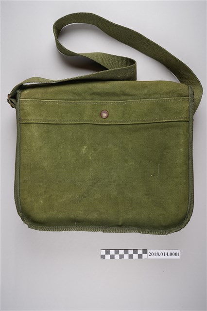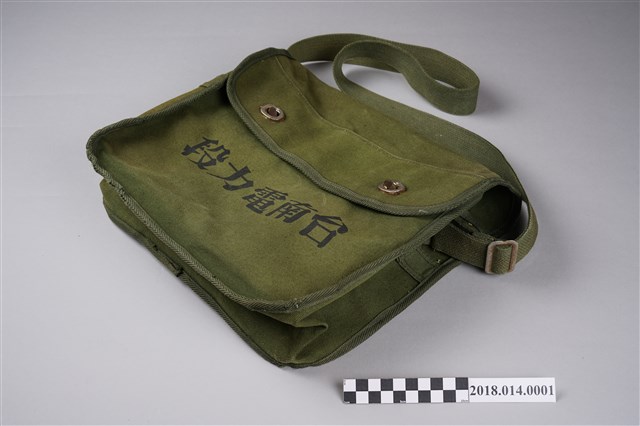 2.本件外觀為深綠色,上面印有「台南電力段」字樣,工作包口有2個轉鎖供開合,轉鎖略有損壞,並有寬4公分可調整長短之肩帶,方便使用者攜帶。工作包內有3夾層,可放置文件與物品,最內側之夾層布料上有分隔的金屬扣。