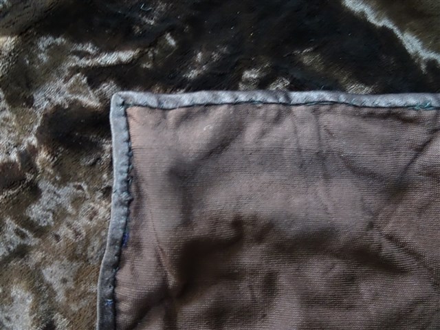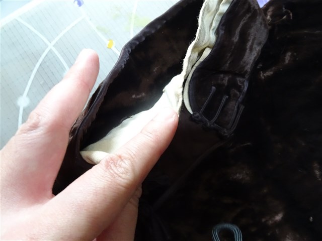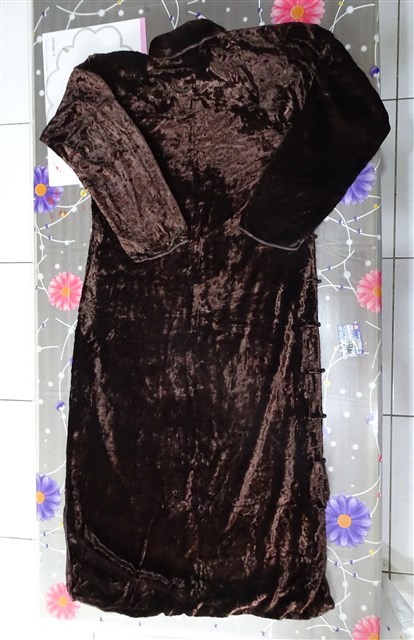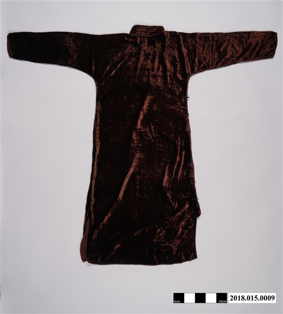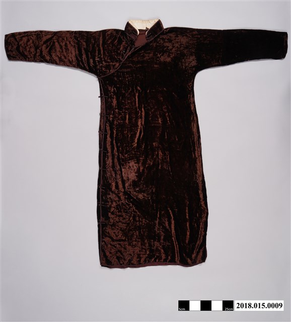 1. 深棕色絲絨長袖女長衫,立領,長袖窄袖,軀幹剪裁呈A字型,無明顯腰身,衣長約及小腿,襟開右衽,直扣,領口、袖口、開襟與下襬等帶有黑棉布細滾邊。內裡為黑棉布,質地較厚,推測為秋冬服飾。全件以機械縫製而成,領口內側另有一圈白棉布隔襯。絲絨布質地柔軟光亮,多作為正式場合之穿著。 2. 本件根據捐贈者提供之家族照片,推測為王白招女士日治時期中年穿著服飾。