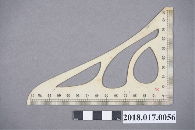 塑膠製、洋裁用縮尺,形狀為三角板,縮尺有二面,比例一面1/4、一面1/5,以公分標記,是實際尺寸縮為四分之一或五分之一的刻度尺,用於做衣服時繪製縮小圖使用。 本件為林何賽秋於做衣服時使用的洋裁工具。