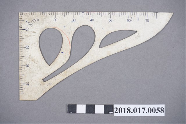 塑膠製、洋裁用縮尺,形狀為三角板,縮尺有二面,比例一面1/4、一面1/5,以公分標記,是實際尺寸縮為四分之一或五分之一的刻度尺,用於做衣服時繪製縮小圖使用。 本件為林何賽秋於做衣服時使用的洋裁工具。