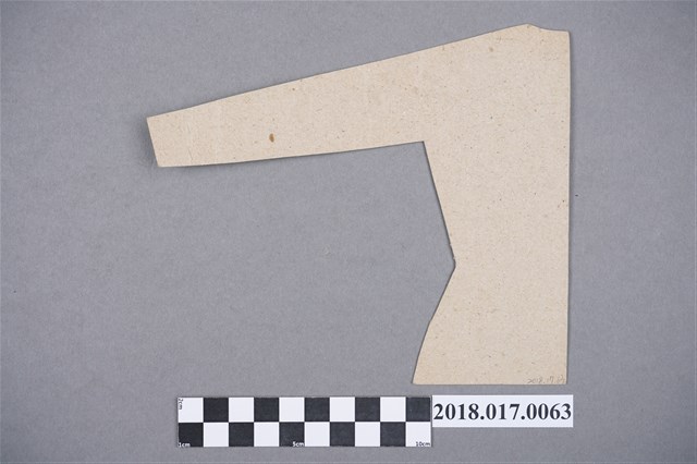 本件為製作女子成衣打版繪圖使用的縮尺,以紙板製成,為上身和袖接續原型,上書寫有「身頃和袖接續的原型」等尺寸文字。 本件為林何賽秋於做衣服時使用的洋裁工具。