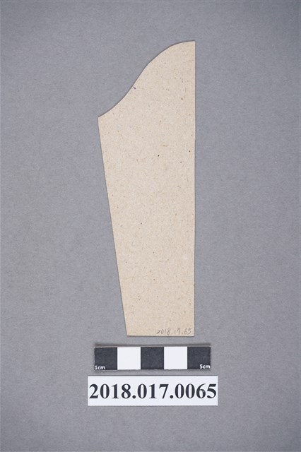 本件為製作女子成衣打版繪圖使用的縮尺,以紙板製成,為袖子原型,上書寫有「肘巾」等尺寸文字。 本件為林何賽秋於做衣服時使用的洋裁工具。