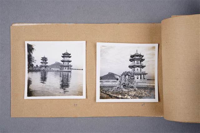 高雄蓮池潭春秋閣一景,左側為半屏山。