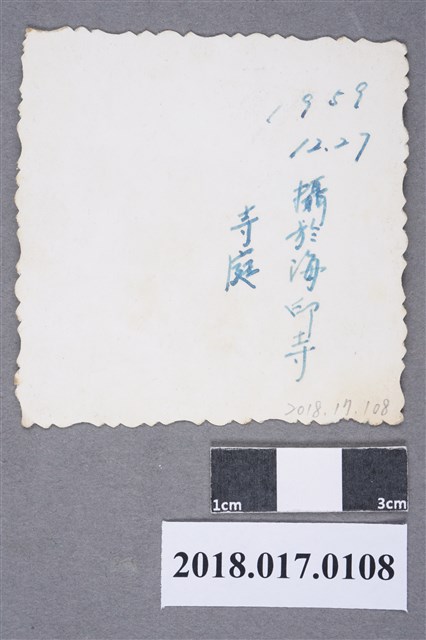 林坤佐(左)於金門當兵時,與三名軍中同袍攝於金門海印寺,照片背面寫有「1959.12.27攝於海印寺寺庭」。