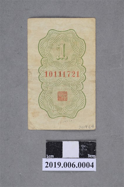 本文物為浙江地方銀行發行壹分紙鈔。光緒34年浙江巡撫馮汝揆設立「浙江官銀號」,宣統1年改組為「浙江銀行」,民國1年浙江銀行改稱「中華民國銀行」,民國4年改組為「浙江地方實業銀行」,民國12年將官商股本分為商股「浙江實業銀行」及官股「浙江地方銀行」。此為壹分版本,鈔票版面正面為藍色,背面為綠色直式,正面印有「浙江地方銀行」及「壹分」字樣,背面為紙鈔編號。