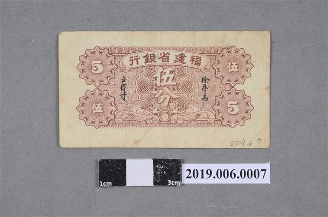 本文物為福建省銀行發行伍分紙鈔。民國14年10月福建省銀行成立,原為官辦,之後改為官商合辦,總行設立於福州,民國27年增設海外機構,推行僑匯業務,並將總行遷至南平。此為民國29年伍分版本,鈔票版面為正面綠色,背面棕色橫式,正面印有「福建省銀行」、董事長總經理章及湖心島圖像,背面為當時的董事長徐學禹及總經理邱漢平簽字。